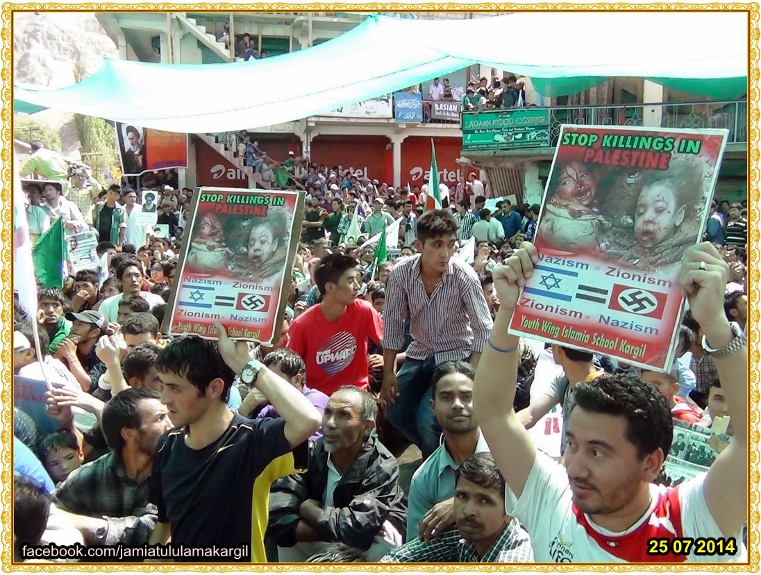 بت شکن عصر امام خمینی رحمتہ اللہ علیہ کے فرمان پر لبیک کہتے ہوۓ دنیا بھر کے مسلمانوں کے ساتھ ساتھ ضلع کرگل میں بھی رمضان المبارک کی آخری جمعہ یعنی جمعتہ الودا کو عالمی یوم القدس کے مناسبت سے زیر قیادت مرکزی امام جمعہ والجماعت کرگل حجتہ الاسلام وامسلمین آقای شیخ محمد حسین مفید ، غاصب صہیونی بلخصوص اسرائیل ، تکفیری داعش ، امریکہ اور انکے حامیوں کے خلاف اور مظلوم فلسطینی عوام بلخصوص غزہ ، عراق ، پاکستان ، بہرین کے عوام کی حمایت میں بعد از نماز جمعہ حوزہ علمیہ اثنا عشریہ کرگل سے ایک عظیم احتجاجی جلوس نکالا گیا اس جلوس میں ضلع بھر کے عوام اور بلخصوص براداران اہل سنّت نے نہایت ہی جوش و جذبے کے ساتھ شرکت کیا۔ جلوس میں شریک مظاہرین امریکہ مردہ باد ، اسرائیل مردہ باد ، بیت المقدس کو آزاد کرو، غزہ کے مظلومو ہم تمہارے ساتھ ہے، عراق کے مظلومو ہم تمہارے ساتھ ہے، پاکستان کے مظلومو ہم تمہارے ساتھ ہے جیسے فلک شگااف نعرے لگا رہے تھے، یہ جلوس جمعہ حوزہ علمیہ اثنا عشریہ کرگل سے نکل کر مرکزی بازار سے ہوتے ہوۓ لال چوک سے واپس حوزہ علمیہ اثنا عشریہ اسلامیہ سکول چوک پر جلسے کے ساتھ اختتام پزیر ہوا۔