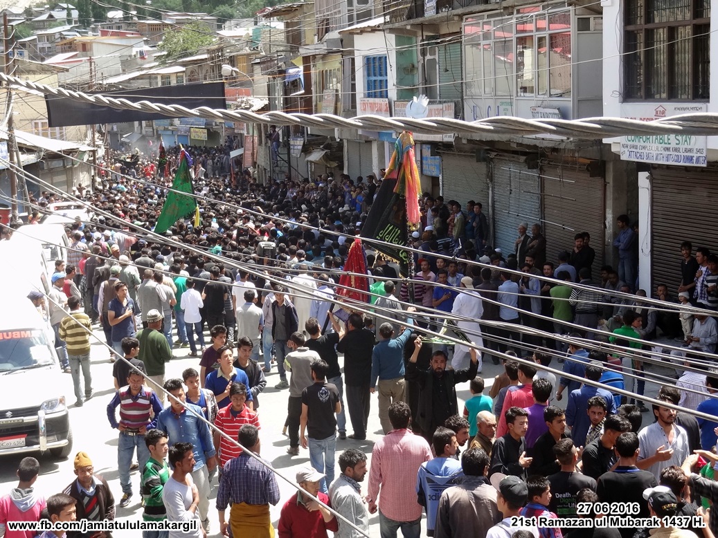 The main procession was starts marching from Houza Elimayah Asna Asharia Islamia School Kargil after the zohar prayers under the banner ofAnjuman Jamiat ul Ulama Asna Asharia Islamia School Kargil Ladakh in which processions from Baroo , pashkum and Changchik/Thaskangrong joined to commemorate the Martyrdom Anniversary of Imam Ali (A.S.).